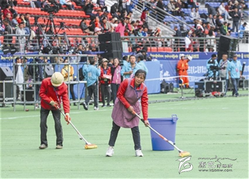工人們清理演出場地。 張兵 攝