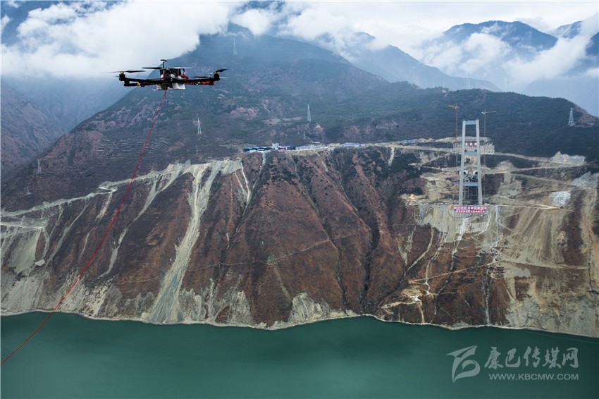 無人機將小繩送到對岸,工作人員再利用小繩拉大繩,最后把鋼繩拉過大渡河架設(shè)牽引系統(tǒng)。