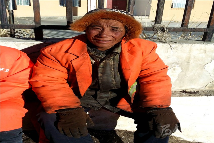 春節(jié)快到了,石渠的最低氣溫已低至零下20余攝氏度,在這呵氣成霜、滴水成冰的季節(jié),大街小巷卻仍然能看見身穿橙色工作服還在起早貪黑地辛勞工作著的人們,他們就是石渠的環(huán)衛(wèi)工人。年近60的澤仁羅布便是其中的一員,雖然他雙頰已被風(fēng)霜刻畫出道道溝壑,但身體卻很硬朗,閑暇的時(shí)候他喜歡和大家在工作的附近找一處陽(yáng)光充足的地方曬曬太陽(yáng)、聊聊天。