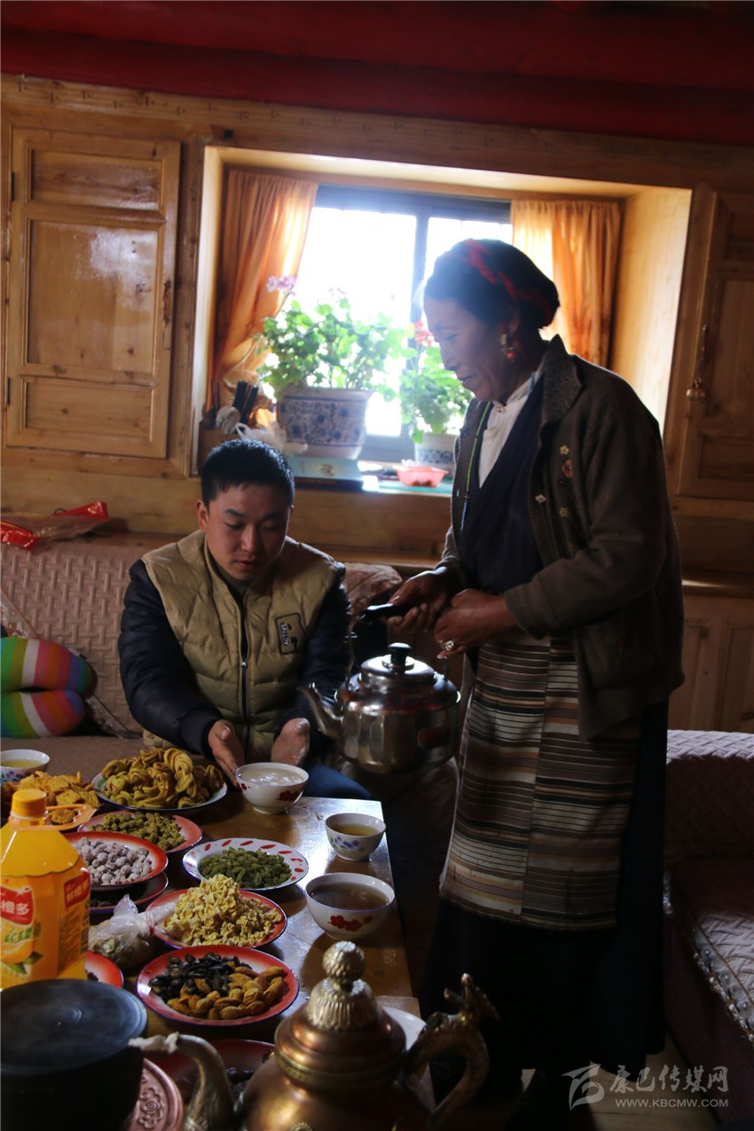 離開(kāi)合作社,記者一行受邀前往村支部書(shū)記澤吉家里做客。汽車在整潔的入戶公路上行駛一陣后,一棟外觀精巧、色彩繽紛的寬大全木質(zhì)民居出現(xiàn)在記者眼前。走進(jìn)客廳,幾張擺滿了各種水果、飲料、干果、糖、酥油果子的藏桌引起了記者的注意,一位十來(lái)歲的女孩正在觀看藏歷新年春晚??吹接锌蜕祥T,澤吉的愛(ài)人立刻端來(lái)了熱騰騰的酥油茶和黃澄澄的青稞酒。