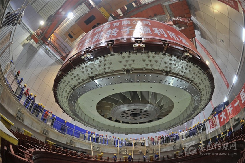 該轉(zhuǎn)子外徑尺寸12.5米、高3.6米、總重量1240噸,歷經(jīng)145天組裝完成,經(jīng)檢測該機組轉(zhuǎn)子圓度、磁軛波浪度等質(zhì)量指標(biāo)均超過廠標(biāo)及國優(yōu)標(biāo)準(zhǔn),優(yōu)于集團公司精品工程要求。圖為組裝現(xiàn)場。