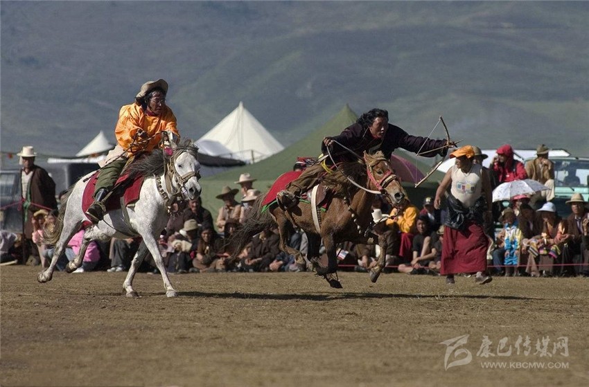 賽馬活動中的分耐力賽、小走賽、馬術(shù)表演等,馬術(shù)表演有馬背倒立、飛馬射擊、馬肚藏身、俯身拾哈達(dá)等項目。驚險刺激的賽馬,是充分展示藏區(qū)群眾健壯、靈巧和勇猛、膽大的一項活動,也是當(dāng)?shù)厍鄩涯瓯绕雌潴w魄、智慧和膽識的舞臺,對年輕小伙兒來說,這還是一個捕獲心儀的姑娘的芳心的絕好時機(jī)。所以,在康巴地區(qū)的賽馬活動始終都保持著精彩、激烈的特征。