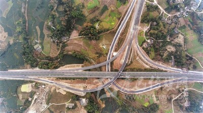 上午11時許,當(dāng)記者驅(qū)車到達對巖樞紐互通立交,用無人機從空中俯拍,這個縱橫交錯、恢弘磅礴的交通樞紐,宛如盤旋在云端的銀龍,又似在大地上延伸的血脈,其造型、規(guī)模、結(jié)構(gòu)都令人嘆為觀止。