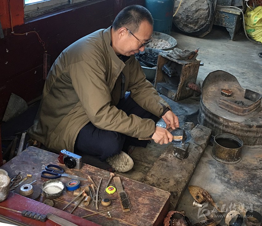 河坡民族金屬手工技藝歷史悠久,盛行于藏民族英雄嶺·格薩爾時(shí)期,至今大約有1300多年的歷史。調(diào)研組每到一處,都要與手工藝人們進(jìn)行深入細(xì)致的交談。在手工藝傳承人布洛家中,見(jiàn)到了正在忙碌制作各種手工藝產(chǎn)品的場(chǎng)景,專家們立即拿出相機(jī)開(kāi)始拍照。同時(shí)抑制不住激動(dòng)的心情,參加到制作中去,有人一邊手持工具現(xiàn)場(chǎng)體驗(yàn)河坡民族手工藝的鍛造,一邊饒有興致地說(shuō):“這里好似人間仙境,就如站在云端學(xué)手藝”。