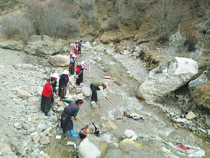 說干就干,黃先明帶領(lǐng)駐村工作隊(duì)隊(duì)員和村兩委班子成員不畏嚴(yán)寒,首先把全村的道路、公共設(shè)施場(chǎng)地進(jìn)行了清掃,把道路兩邊的小土堆全部鏟平并種上花草,把村民房前屋后的柴火、廢料等重新清理并制定擺放標(biāo)準(zhǔn)。在河道整治中,黃先明帶領(lǐng)村干部沖在前面,對(duì)不容易清理到的垃圾,還跳到河里去撿。3月的高原還很冷,鞋子很快被交納河水打濕,但大家全然不顧?!包S隊(duì)長都帶頭干,我們更要努力?!苯患{村村民巴登鄧珠說。