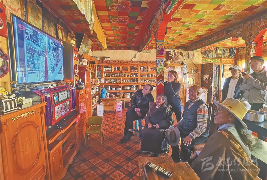 石渠牧民貢洛和家人在家中收看慶祝大會(huì)電視直播。