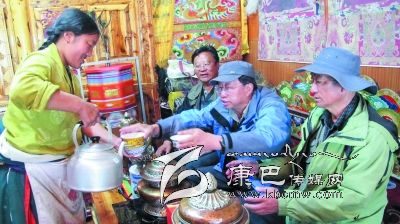 位于宗塔草原“大盆地”東邊山坡的降巴牧場在隊員們的心里也留下了深刻的印記。15日早上5點半隊員們就出發(fā)上了降巴牧場。朝霞映紅了天邊,紅云罩著青草牛糞味飄香的草坡。比采風(fēng)隊員們起得更早的牧人已擠完了牛奶,一個僅10 歲的女孩正在草坡上拾牛糞;牛毛帳篷里,勤勞的牧婦已打開了牛奶分離器開始分離酥油了……一問,方知牧民們今晨4點就起床勞作,干完早上的活兒,他們要趕到三公里遠(yuǎn)的“盆地”耍壩子,看賽馬。這個牧場靜謐潔凈得令人稱奇,青青的草坡上絕少有垃圾存留,沒見到一只兇惡的牧犬;按季節(jié)劃分的草場由整潔的網(wǎng)圍欄圈開,分隔有致;牧人舉家出門,連帳篷門也不掩,據(jù)說這里沒有偷盜發(fā)生,家人和諧;古老、平和的氣氛中,晨風(fēng)輕拂,野花青草搖曳,輕柔的晨霧中偶而傳來兩聲牛哞,讓人頓感心靜如水。對于長期居住城市的人來說,這里無疑是“幽雅天堂”了。