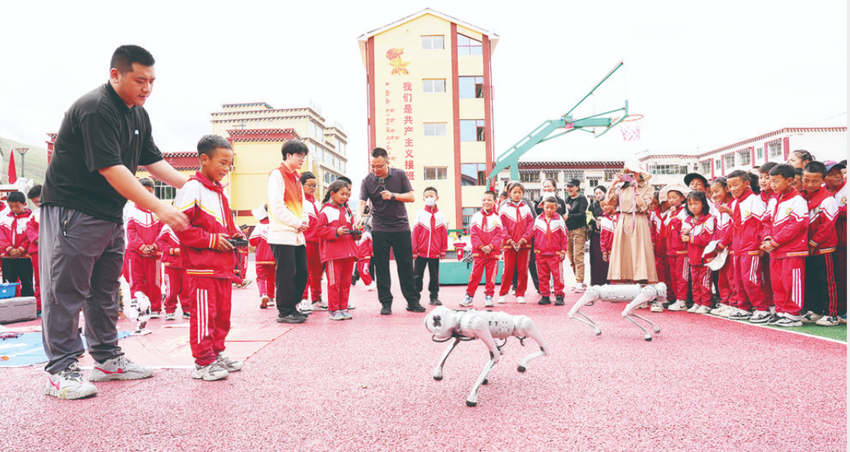 老師指導(dǎo)學(xué)生操作機(jī)器狗。