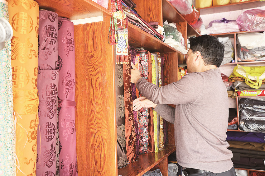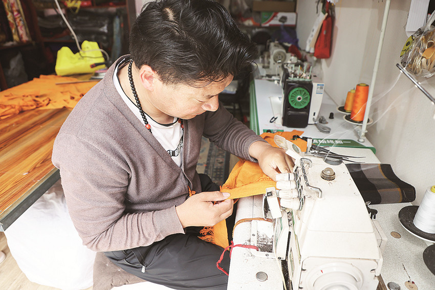 “傳統(tǒng)藏裝需要手工制作,青年、中年、老年人的款式各不一樣,料子也很有講究,還有裝飾也很重要……”說起登龍服飾,扎西澤仁神采飛揚,不時發(fā)出爽朗的笑聲,他說,“一般簡單的服裝制作僅需半天,復雜一些的要兩三天,價格從幾百元到幾千元不等。現(xiàn)在縣城的商店生意很好,每天都能接到很多訂單,在登龍鄉(xiāng)的鋪子交給徒弟打理也完全沒有問題。”