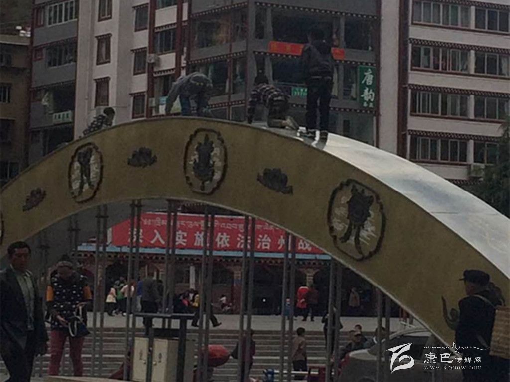在康定劇場前面的廣場上,每天傍晚,廣場舞大叔大媽都準時前來報到。孩子們則在人群中玩耍。7歲的陽陽(化名)被奶奶帶著來到廣場上學習滑旱冰,滑著滑著小伙伴出現(xiàn)了。脫掉冰鞋,陽陽和大家一起開始在“康定情歌”歌譜造型的漢白玉雕塑上攀爬。奶奶則在廣場另一端和老友擺龍門陣,根本無暇顧及。“征服”了“康定情歌”以后,陽陽和伙伴們繼續(xù)“征服”康定劇場臺階前的大塊漢白玉雕塑。“趕快下去,這些娃娃真沒得家教!”一位愛管閑事的中年人制止了孩子們的“不文明”行為。他離開后,陽陽再次奔向漢白玉雕塑……