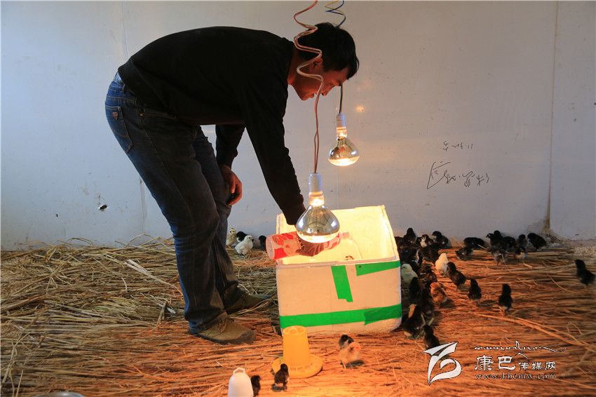 3月16日,在彭澤的引領下,記者走進了新修養(yǎng)雞場內孵小雞的溫室。黃黑兩色羽毛的小雞在溫室里走來走去,看到彭澤走進來,它們搖頭晃腦迎了上來。又到了吃飯、喝水的時間,小雞們準備飽餐一頓。
