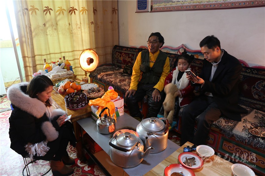 2月27日上午,色達退休干部秋呷老人正和孫女在家中收看康巴衛(wèi)視藏歷新年春晚,享受著屬于他們的節(jié)日。藏桌上擺滿了豐富的年貨,溫暖的家庭處處洋溢著新年的氣氛。