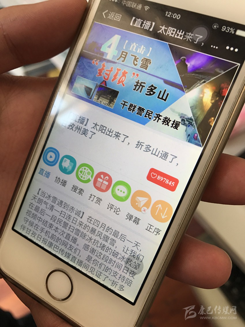 5月2日,隨著5.1小長假結(jié)束,甘孜日報對折多山突降大雪、引發(fā)交通堵塞的立體式報道告一段落,作為突發(fā)災(zāi)害性天氣,甘孜日報行動迅速,傳統(tǒng)媒體、掌上直播、康巴微信、甘孜發(fā)布等全媒體齊上陣,掌上直播《4月飛雪“封鎖”折多山,干群警民齊救援》,以其即時消息、圖片、視頻等海量信息,引發(fā)點擊“狂潮”,不到兩個小時,點擊量即超過35萬人次,至小長假結(jié)束,點擊量近百萬人次;康巴傳媒微信《4月飛雪,千人馳援》點擊量超12萬人次;甘孜日報社對折多山大雪現(xiàn)場立體交叉式直播被新華社、中國新聞網(wǎng)、華西都市報封面新聞、網(wǎng)易新聞頻道等州外媒體分別轉(zhuǎn)載或引用相關(guān)報道。我州應(yīng)急措施有力、有序,得到眾多媒體和網(wǎng)友紛紛點贊。州委常委、宣傳部長相洛稱贊甘孜日報在這次直播中,行動迅速、引導(dǎo)有力,既客觀報道了突發(fā)性災(zāi)害天氣對我州交通和旅游帶來的不利影響,更突出報道了我州和康定市采取的各項應(yīng)急措施,是一次媒體融合的有益嘗試。