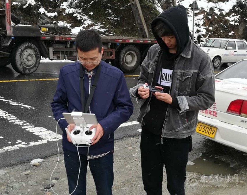 新媒體記者使用無人機進行航拍。