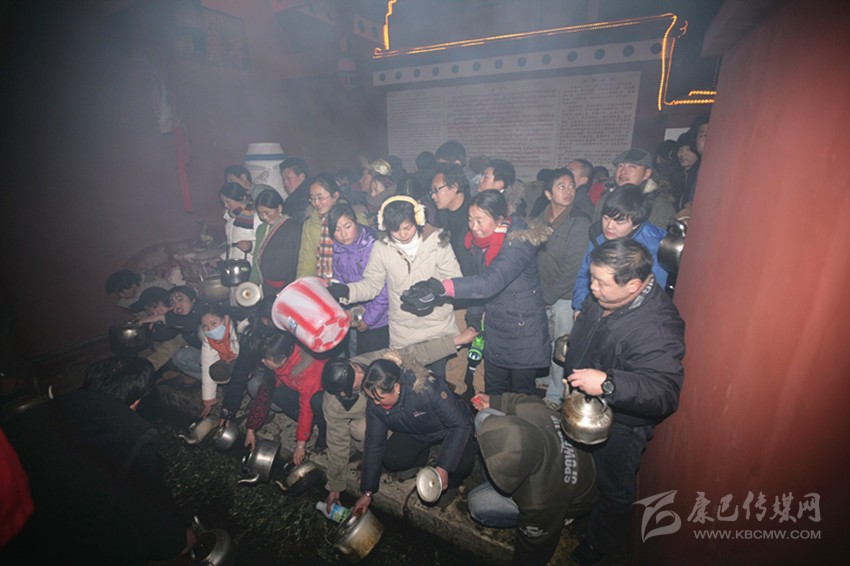 “每年大年三十我都會在這里來搶頭水,傳說郭達山神和跑馬山仙女會化身為一對金鴨在里面戲水。老人們說大年三十到正月初一‘翻年’那個節(jié)點來取水,就能看見金鴨,而水也等同于仙液?!痹趧倓偰隄M40歲的陳先生兒時的記憶中,這里每到春節(jié)“就會有人提著水桶,拿起茶壺排起長龍來看金鴨,搶頭水?!?/span>