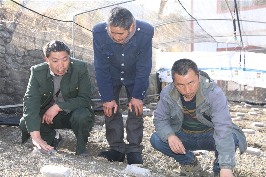 鄧順均(左一)正在查看羊肚菌長(zhǎng)勢(shì)情況。本網(wǎng)記者 馬建華 攝