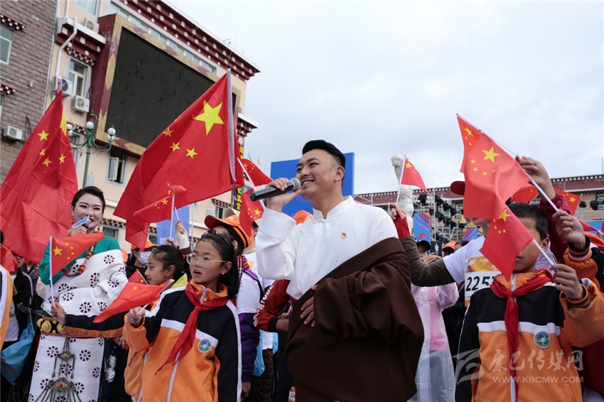 在開(kāi)幕式上,藏族男女飽含真情領(lǐng)唱《歌唱祖國(guó)》,緊接著,托舉五星紅旗的儀仗隊(duì)緩緩進(jìn)場(chǎng)。當(dāng)雄壯的《義勇軍進(jìn)行曲》響起,跑者、老師、學(xué)生、干部、農(nóng)牧民群眾等向冉冉升起的國(guó)旗行注目禮,心里升騰起無(wú)比的自豪。