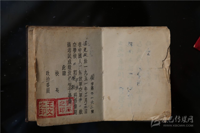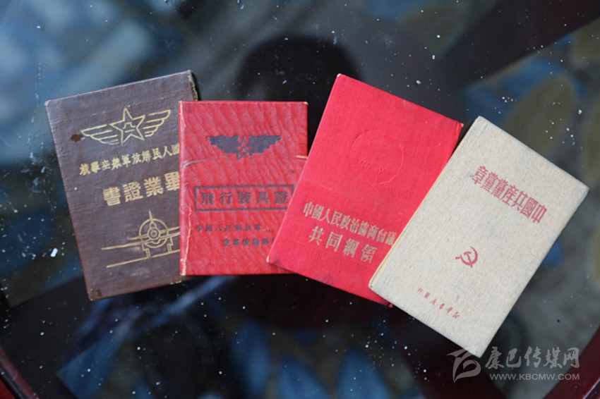 溫克棟的大兒子、57歲的溫樹平拿出大伯留下的遺物——一本中國人民解放軍航空學校畢業(yè)證書、一本中國人民解放軍空軍后勤部發(fā)的飛行裝具證、一本《中國共產(chǎn)黨黨章》、一本《中國人民政治協(xié)商會議共同綱領》,四本珍貴的文物書頁發(fā)黃,有的還有些微殘缺,但卻是珍貴的歷史見證物,溫家視為傳家寶。
