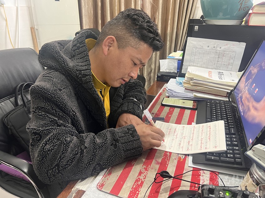 “尼瑪老師不僅對學(xué)生的學(xué)習(xí)生活關(guān)懷備至,作為任課教師,我們常??吹剿谛菹r間認(rèn)真?zhèn)湔n。他會聲情并茂地大聲誦讀精心準(zhǔn)備的課件,大家都覺得很有趣,學(xué)生學(xué)習(xí)的積極性也提高了。他批改作業(yè)也非常認(rèn)真,給每一位同學(xué)寫的評語都用心用情。他是真的是用全部身心來對待工作,不愧是一名優(yōu)秀的老師?!辈稍L過程中,筆者偶遇了援建教師廖俊希,談起對章拉尼瑪?shù)挠∠?,廖俊希的評價細(xì)致而中肯。