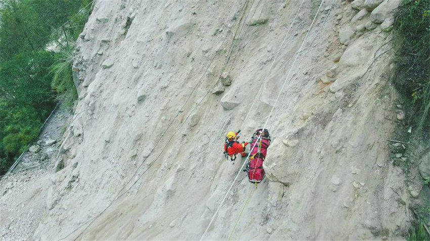 9月7日18時許,救援人員從海螺溝景區(qū)將一位受傷群眾用擔(dān)架運出。因景區(qū)通往磨西鎮(zhèn)的主干道還在搶通中,救援人員采取吊繩、拖拉的方式,將受傷群眾從斷道處向上運送到落差一百多米的安全處,再由等候的救護車運送至醫(yī)療點。四川日報全媒體記者 吳聃 攝