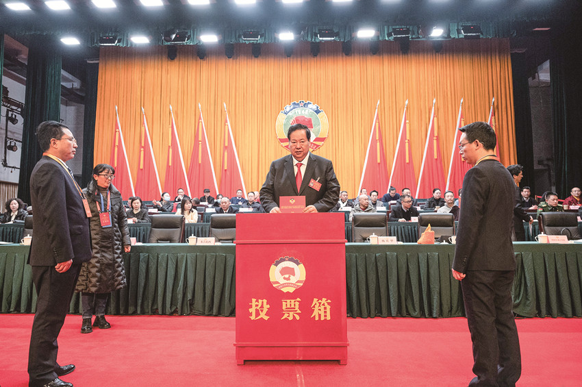 州政協(xié)委員在選舉大會(huì)上投下莊嚴(yán)的一票。