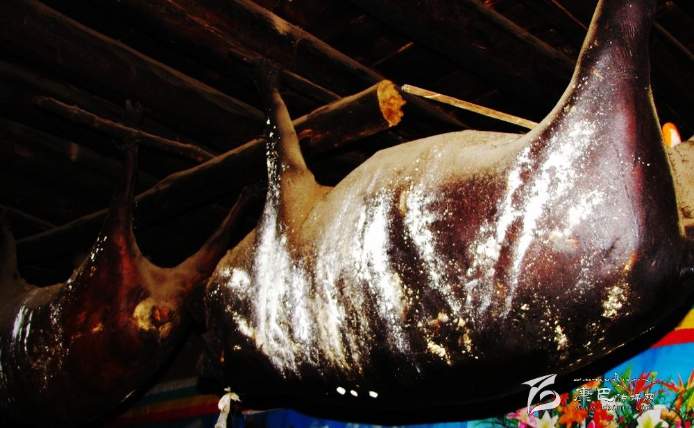 臭豬肉用扎壩語準確翻譯應(yīng)譯“陳豬肉”或“舊豬肉”。由于其惡味乍聞重于“臭豆腐”,濃于廣東的“酶香咸魚”,所以稱“臭豬肉”。但扎壩人卻視之為上品,極其愛吃,并作為居家待客的最高珍品,家家戶戶都要熏制存放,且越存放得久越被視為珍貴,因此,在扎壩地區(qū),家中懸掛多少“臭豬肉 ”和懸掛的年限多少也自然成為當?shù)睾饬控毟坏南笳鳌?br />