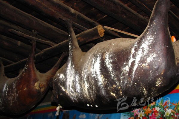 豬膘:在丹巴,豬膘是一種貯存豬肉的方式,是一種飲食習(xí)俗,同時,它又是財富的象征。在丹巴隨便走進一戶人家都可以看到少則幾扇、多則十余扇的豬膘掛在樓上,有些人家的豬膘甚至還貯存十多年之久。這些豬膘大多已經(jīng)被蟲吃掉了許多,但是他們也不會心痛,因為在過去,看一個丹巴人家庭是否富裕,就看他家有多少豬膘,豬膘越多就越富有。
