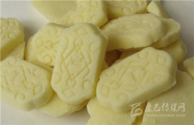 藏族酥酪糕是藏族的著名糕點(diǎn),在藏族同胞的家里常用作款待客人的美味點(diǎn)心。而且它本身具有很好的保健功效,能夠在品嘗美食的同時(shí)又滋補(bǔ)身體。藏族酥酪糕食用起來奶味濃郁,十分受到不同年齡及族群的喜愛,其中還有多種對身體十分有益的材料,例如西藏人參果就是一種純天然無污染的滋補(bǔ)食品。酥酪糕是用提取過奶油后的乳白色淀粉(藏名曲熱)晾干后,用磨磨成粉末,拌入黃油(奶油)、白糖、角麻(人參果)、葡萄干、桃仁等,做成橢圓形、方形,表面有紅絲綠絲擺成圖案,表現(xiàn)吉祥、長壽,放入籠屜內(nèi)蒸熟,賓至可整塊獻(xiàn)上,或切成片狀。據(jù)說它有滋補(bǔ)強(qiáng)身之功效。