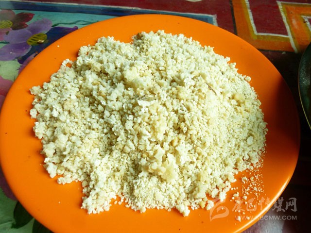 奶渣是奶提煉酥油后剩下的物質,經燒煮,水份蒸發(fā)后,剩下是奶渣,奶渣可以做成奶餅、奶塊。在煮牛奶過程中,還可揭起奶皮,藏語叫“比瑪”。奶皮就像豆腐皮一樣,好吃又富有營養(yǎng)。奶品是藏族的重要食品,家居或外出,人們都帶上它。在零食品種不多的藏區(qū),大人們常把奶渣給小孩當零食。麻森在盤子里放上適量的糌粑、酥油、碎奶渣及碎紅糖,攪混揉合,盛入一方形小木盒內,用手塞滿、壓實,即可制成麻森方形糕,其味香甜可口。
