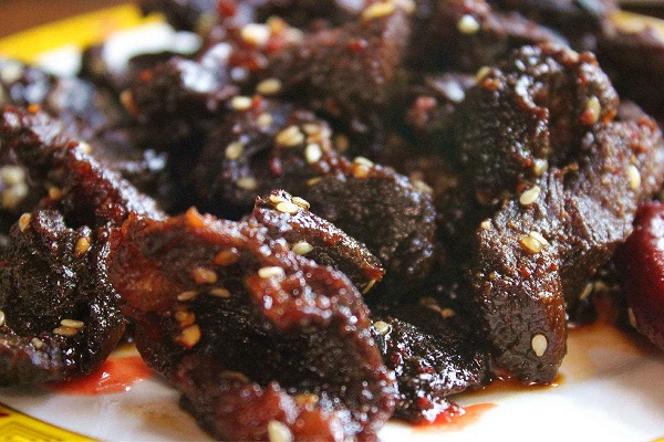 3500米以上地區(qū)這些地方生長著許多野生藥種如貝母,蟲草等,耗牛常食這些藥材,其肉鮮美無比,殺后可炒紅燒,清燉或涼曬成干巴等,其味獨特,吃耗牛肉在迪慶,實在是一種享受。并可在市場購買干巴,肉松等作饋贈青朋好友的禮品。牦牛肉可以粘辣椒油,味道仍然鮮美??刀ǖ呐H獠粌H有牦牛肉,還有熏牛肉等等,比起其他康定特產更是別具一番風味。