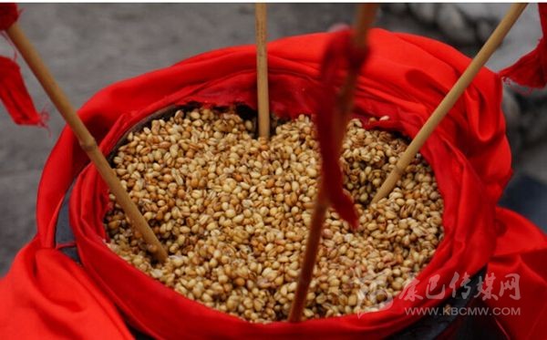 嘉絨語稱“恰鹵”。咂酒是青稞釀制而成的。首先取一定數量的青稞粒,一般5斤、8斤或10斤,在大鐵鍋中用水煮成八成熟后,放在簸箕里晾開,待冷卻后放上一定比例的酒曲,合勻,又裝入大鐵鍋中發(fā)酵三至四天,待聞到酒香味后,裝入壇中并加水,放置一天以上后,即可取汁食用,這個汁就是咂酒。咂酒味甘甜淳厚,十 分爽口,看似不醉人,但有的甘甜之中略帶苦澀,說明酒勁足,不勝酒力者應少飲為宜。曾有人寫《飲咂酒詩》說:“成石雜糧一甕收,王侯到此也低頭,五龍抱住 撐天柱,咂盡黃河水倒流”。充分展示了咂酒的魅力和飲咂酒的那種愜意。境內巴底、半扇門的上半鄉(xiāng)、太平橋鄉(xiāng)一帶的群眾喜愛煮咂酒,平日,家家都備有咂酒,親朋間禮尚往來、人情世故都送咂酒。喝咂酒是當地的一大習俗?!墩鹿韧椭?略)》記載了清朝后期宅壟土屯區(qū)的飲食習俗時說:“夷人(封建統(tǒng)治者對藏族的貶 稱)寨中置巨甕或木桶,富者大銅瓶盛酒,于內植竹竿十余枝,跌坐于地互相吸飲,不杯杓勸酧(酬),無餚核(指熟食的魚肉干果),惟各布豬膘、牛肉、‘得木 鳥’(火燒子饃饃),醉飽而散”?,F在,巴底鄉(xiāng)、半扇門的上半鄉(xiāng)、太平橋鄉(xiāng)的大多數村寨仍然保留著這些習俗。在節(jié)日或慶典之時,在大壩子中間放一個大的壇子或木桶,里面盛滿含有酒糟的咂酒,然后插入麥桿數根,眾人圍個大圓圈跳鍋莊,口渴時依次吸之;或一人手持葫蘆,里盛咂酒,在眾人中依次轉之;或眾人盤腿 圍坐,傳一壺咂酒,稱喝“轉轉酒”。