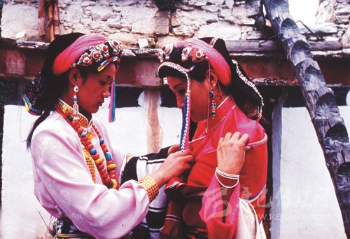 康區(qū)婦女戴頭帕很有特色,嘉絨婦女繡花頭帕,以長方形帕對折,戴于頭上,額前伸出約3公分,腦后下垂至后枕,寬至兩鬢,然后用大紅頭繩或五彩頭繩辮發(fā)盤于帕上,辮子套各式辮飾??的蠇D女戴頭帕時,額前折褐成帽狀,腦后成巾狀下垂至肩。木雅婦女戴袋狀帽,將帽沿一側內疊扣于買上,上沿額伸出頭額前約3公分,寬至兩鬢,長約30公分的袋狀帽箭垂于腦后,然后用大紅頭繩或五彩頭繩編發(fā)辮纏盤于帽上。魚通人則用長丈余之青綾布纏裹頭部,形成碩大的盤頭。
